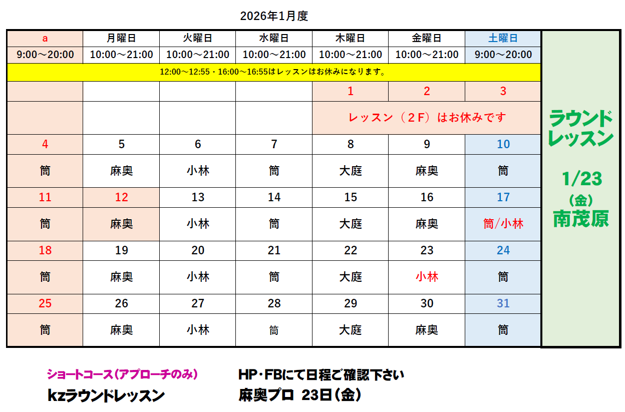 2026年1月のインストラクター出勤表